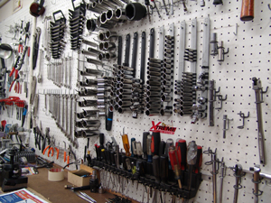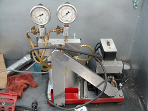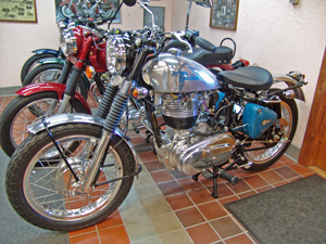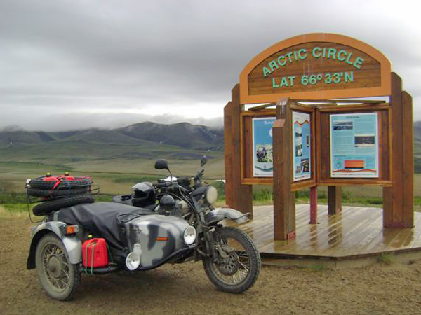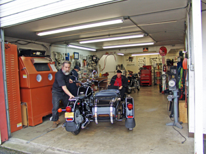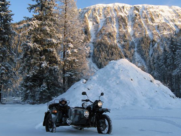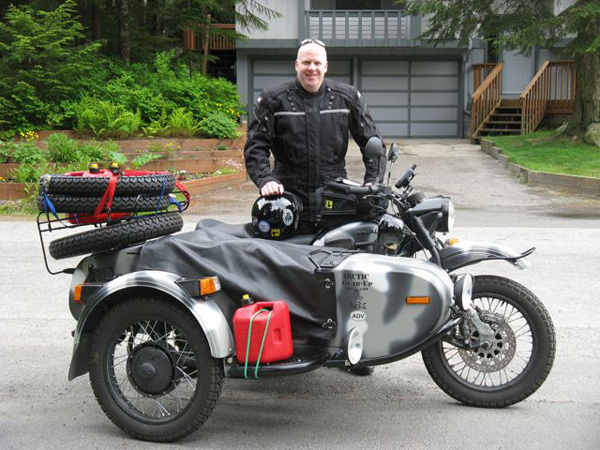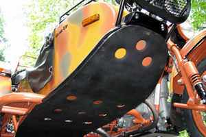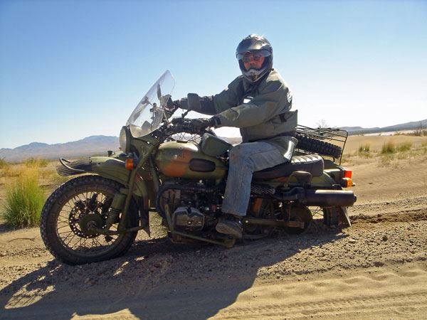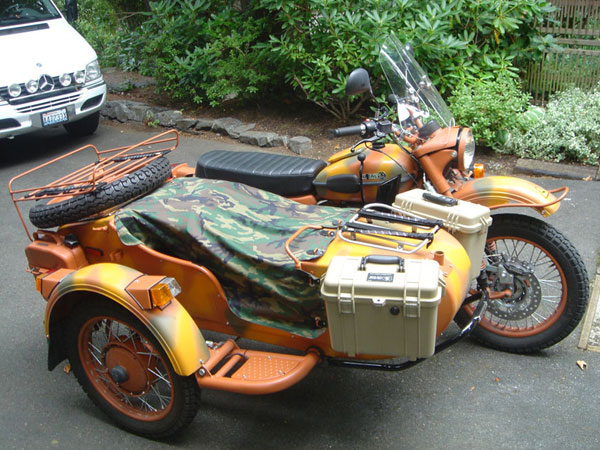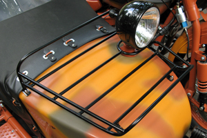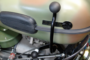 A specially modified Gear-Up! So far, this rig has run flawlessly, and has even made a run down into the Barranca del Cobre (Copper Canyon), in the state of Chihuahua, Mexico. Special modifications made by Raceway Services include a set of custom upswept muffles, hand-operated tank-shifter and reversing lever, hill-holder parking brake, and strengthened 2WD actuation rod. The owner has mounted a set of Pelican cases up front, a set of auxiliary fuel canisters in the rear, and a luggage rack on the nose. In addition, two Euro-style auxiliary power outlets have been added to the left-hand side cover (one wired to a heat-controller for an electric jacket liner), and a Garmin GPSMAP 376C GPS receiver is mounted on the handlebars.